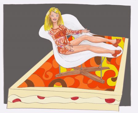 Et à l'anniversaire surprise de mes 40 ans, MissMad et Calou m'ont ô combien émue et émerveillée en créant une installation sur fraisier de cette Barbie assise sur la Lounge Chair de Eames sur un puzzle trouvé au Conran Shop représentant un motif "psychédélique" très 70. Avec son ensemble orange, ça y est, je l'avais ma Barbie 70. La boucle était bouclée.
