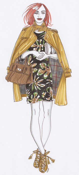 Cécile, 28 ans est une fille timide et peu sûre d'elle. Pour un premier rendez-vous d'embauche à Londres, elle a décidé que son allure serait sa carapace. Elle a longuement médité devant les magazines de mode et s'est lancée. Un trench porté sur les épaules comme une cape, à la Roitfeld, un sac Mulberry (emprunté à une amie) à la Alexa, une robe imprimée de fleurs géantes (ici, vintage, mais il y en a de ravissantes chez Antik Batik), des sandales lacées Pucci (une folie) et un carré décoiffé à la Roitfeld également. Ainsi, elle se sent forte et femme.